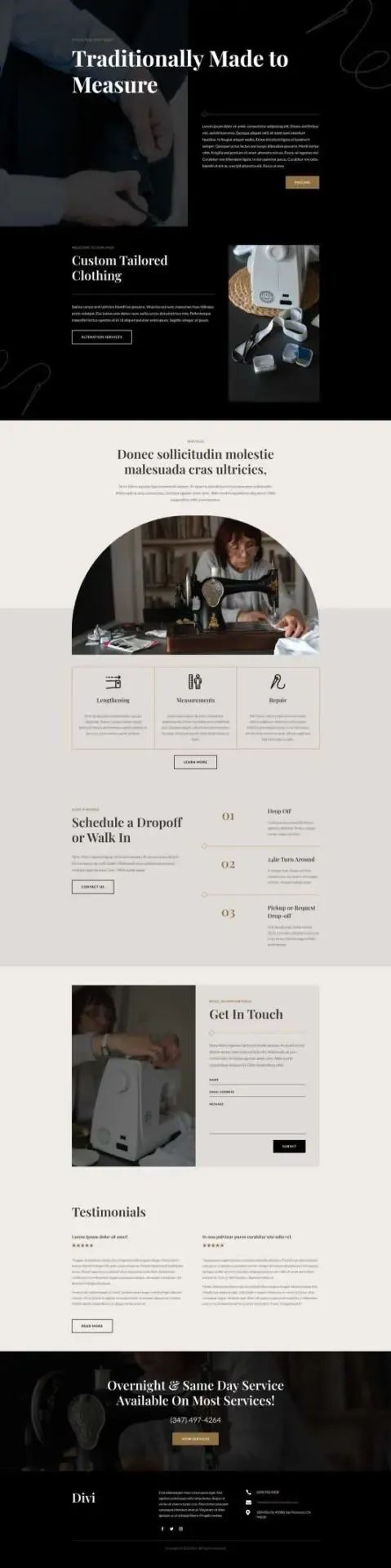 The Alteration Shop Layout Pack for Divi offers a high contrast design complete with dark backgrounds and bold white text to showcase your alteration business. The warm dark gold accents allow for your site’s visitors to easily identify call to actions, as well as other points of interest. This classic design gives you everything you need to show off your alteration business with class.