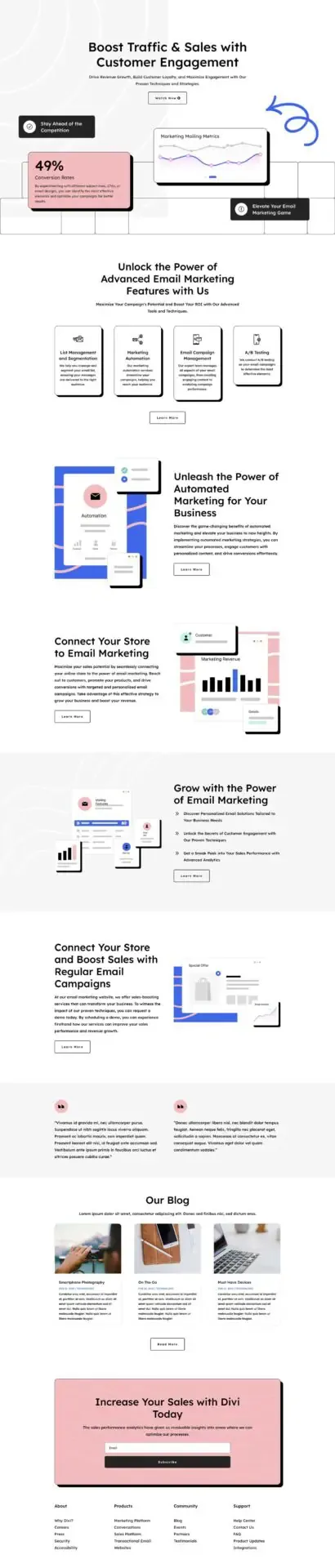 Do you need an email marketing website for yourself or a client? Look no further than the Email Marketing Layout Pack for Divi, designed to skyrocket your traffic and drive sales. This incredible pack combines eye-catching movement and vibrant pops of color, blending seamlessly with compelling text, resulting in a design that will effectively showcase your email marketing business.