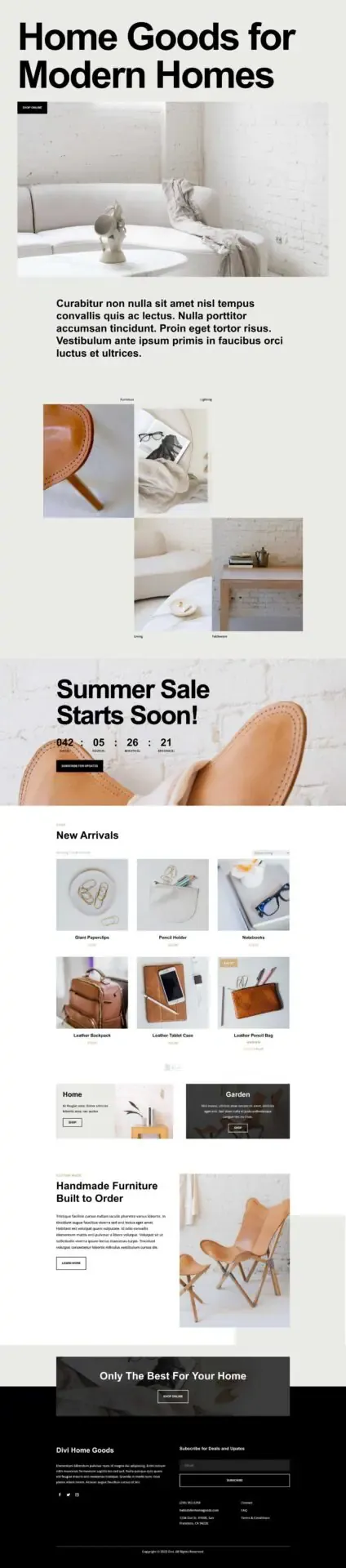 Are you looking to upgrade your home store or boutique with a new style? The new Home Goods Layout Pack for Divi is a great place to start. You can showcase your products beautifully with bold oversized text and interesting imagery, dedicated product sections, an effective call to action with a countdown timer, and more.