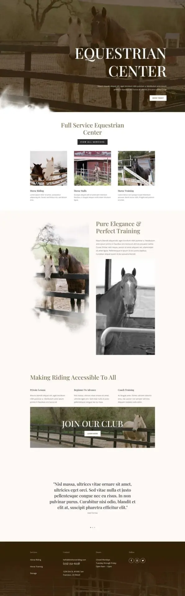 Are you looking to set up a website for your horse riding business? Make sure to check out the Horse Riding Layout Pack for Divi! This layout pack features beautiful (royalty-free) images, an elegant design style, and a brown color palette that matches the business type effortlessly!