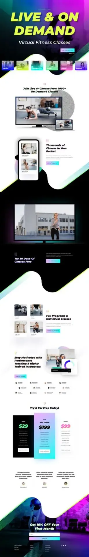 Virtual Fitness is a thriving industry. Fitness companies and instructors deserve an online presence that inspires their audience. And this Virtual Fitness delivers! The design is bold, clean, and strikingly colorful. And the included page layouts will make it easy to promote various programs, live and on-demand classes, and much more.